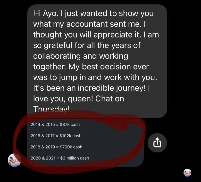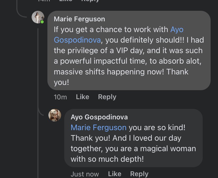 I was looking for a coach. I wanted someone who had mastered seven figures. I was looking for someone who had a profound connection with the spiritual realm. It would also be OK if she was gorgeous, sexy, and a motherfucking genius. I happened to find all of that in Ayo. Our connection was instantaneous. She had tattoos on her body of statues that I had in my sanctuary. We had an instantaneous and immediate multi lifetime connection of mind, soul, and heart. She did a deep dive into my business like no one ever had. She said to me, “you have everything that it takes. You’re just not advertising or marketing enough.” She was right. I have been in hiding and she brought me out of obscurity. She also said, “People have no idea who you are, but once they know you’ll be making so much money it’ll be crazy.” So I followed her advice and money is literally raining from the sky. We got to meet in California. We got to visit again in New York and we’re headed to Dubai with a bunch of friends at the end of the year. She’s become one of my favorite people in the universe. Her integrity is fierce. Her mind is razor sharp on the eyes on the eyes. And her playfulness and laughter are epic. She also has one of the most fabulous collections of wigs I’ve ever seen. This Goddess is precious, and I love her as I always have and always will. She has changed the very fabric of my existence. For that, I am eternally grateful. I could not recommend her more highly. But be warned, she will make you work your ass off and it’s worth every moment.