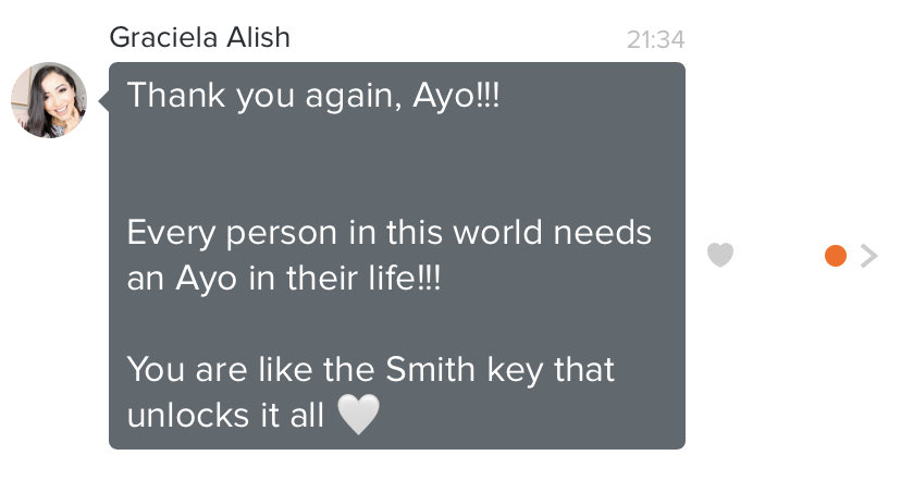 "Firstly, a big thank you! You gave us so much of your time! Ayo has some super powers when it comes to unlocking other people's super powers! When it comes to being your best and performing at your optimal, Ayo is your coach!"