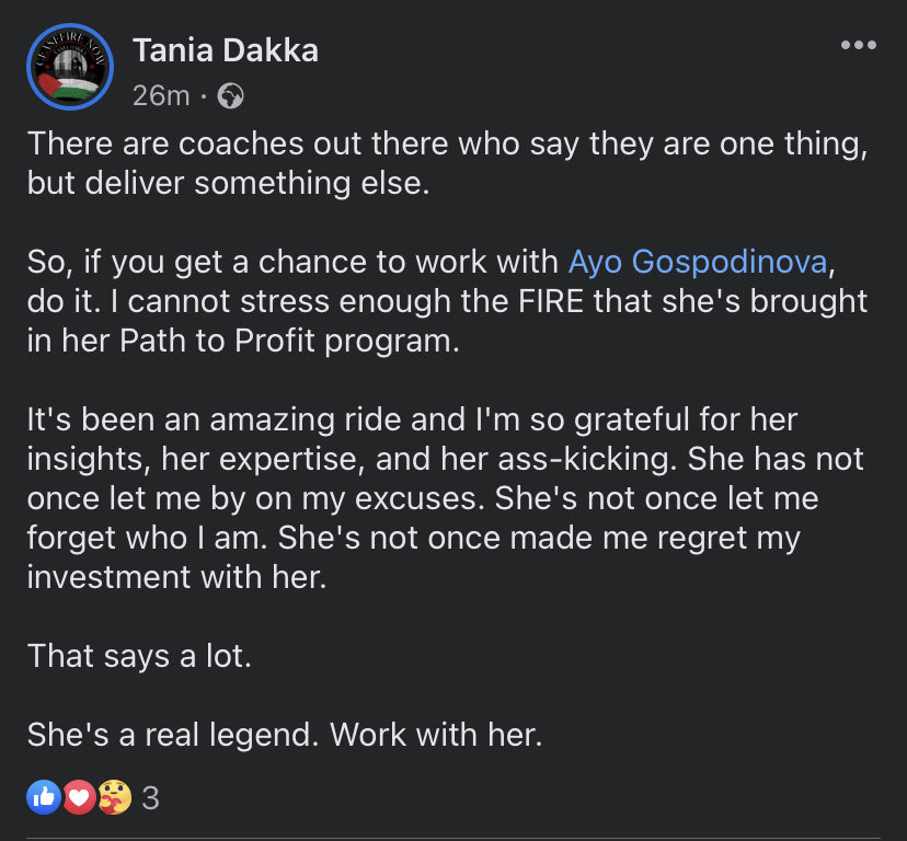 "Ayo is one of these people who just makes marketing, sales and business so much easier and so much fun. She's also one of the smartest people I've ever met. Being coached by her was a game-changer!"