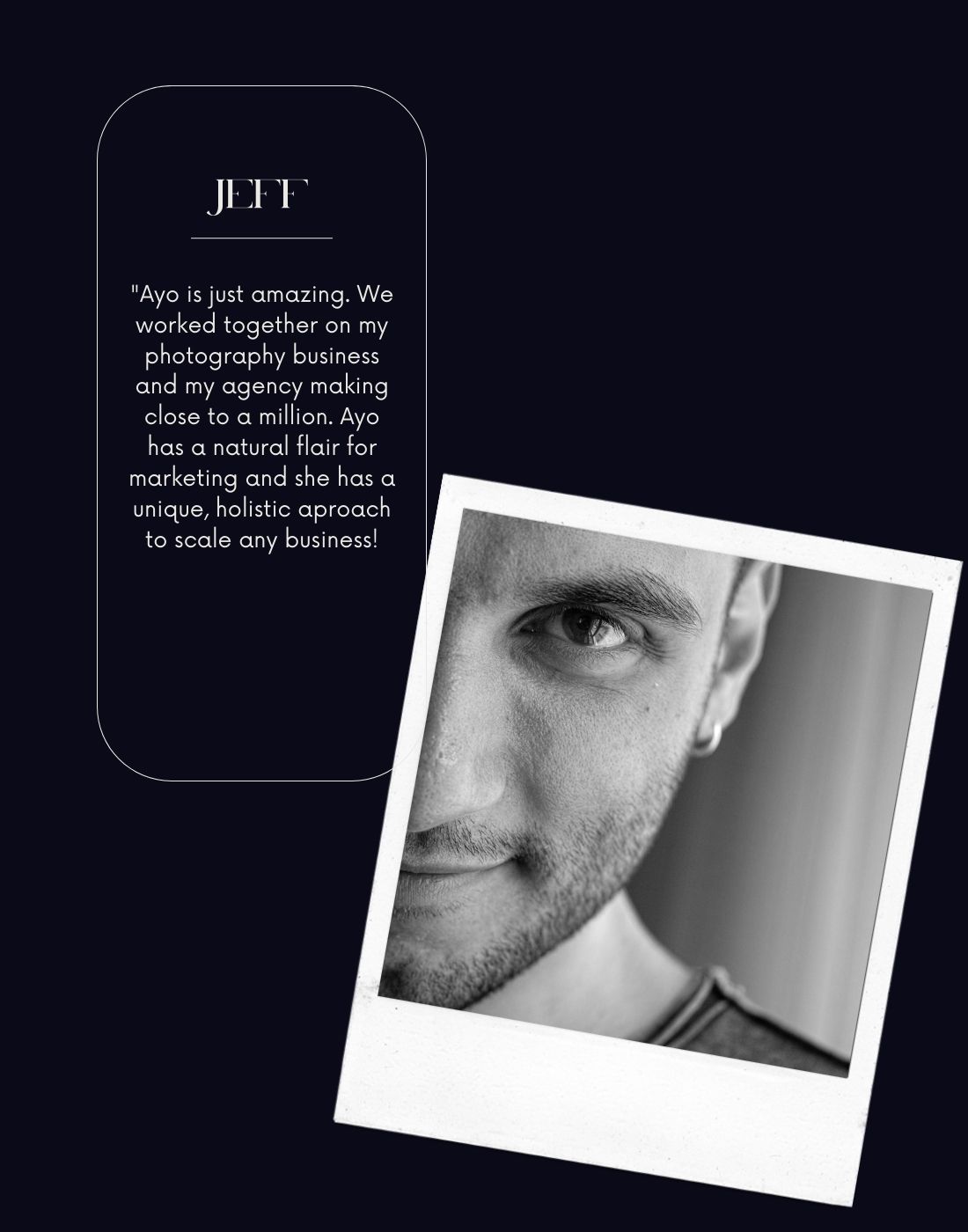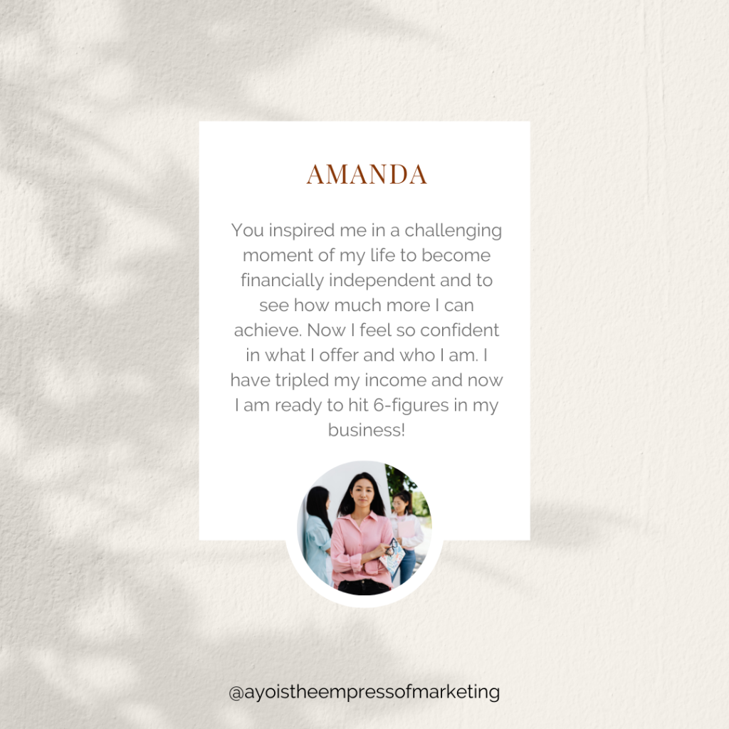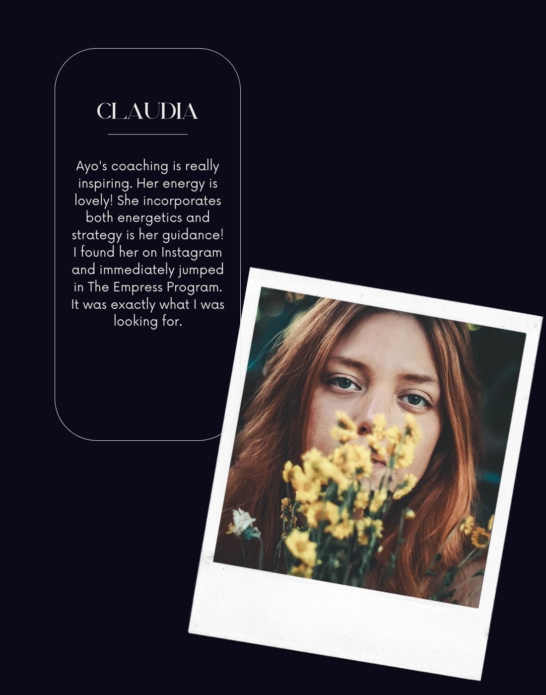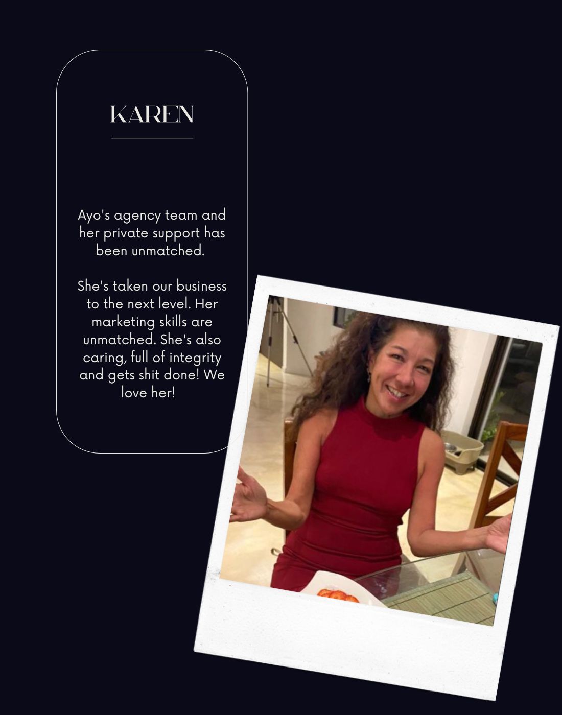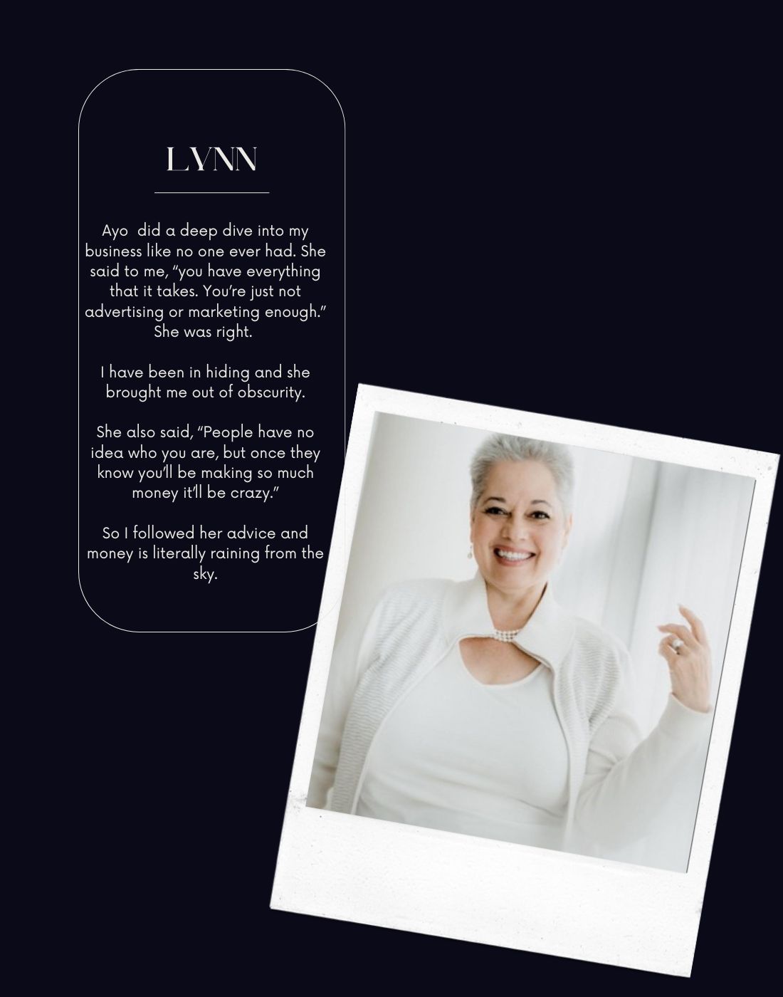 Working with Ayo created a true before and after in my life and business. When I joined her Mastermind, I knew instantly it was my next step, no calls, no hesitation. From day one, her direct yet deeply loving approach led to powerful breakthroughs, especially around identity and separating myself from my business, which completely transformed how I grow, lead, and make decisions. The clarity and ease I have now are a direct result of this experience. If you feel the pull toward this Mastermind, trust it. It is a sign you are ready.