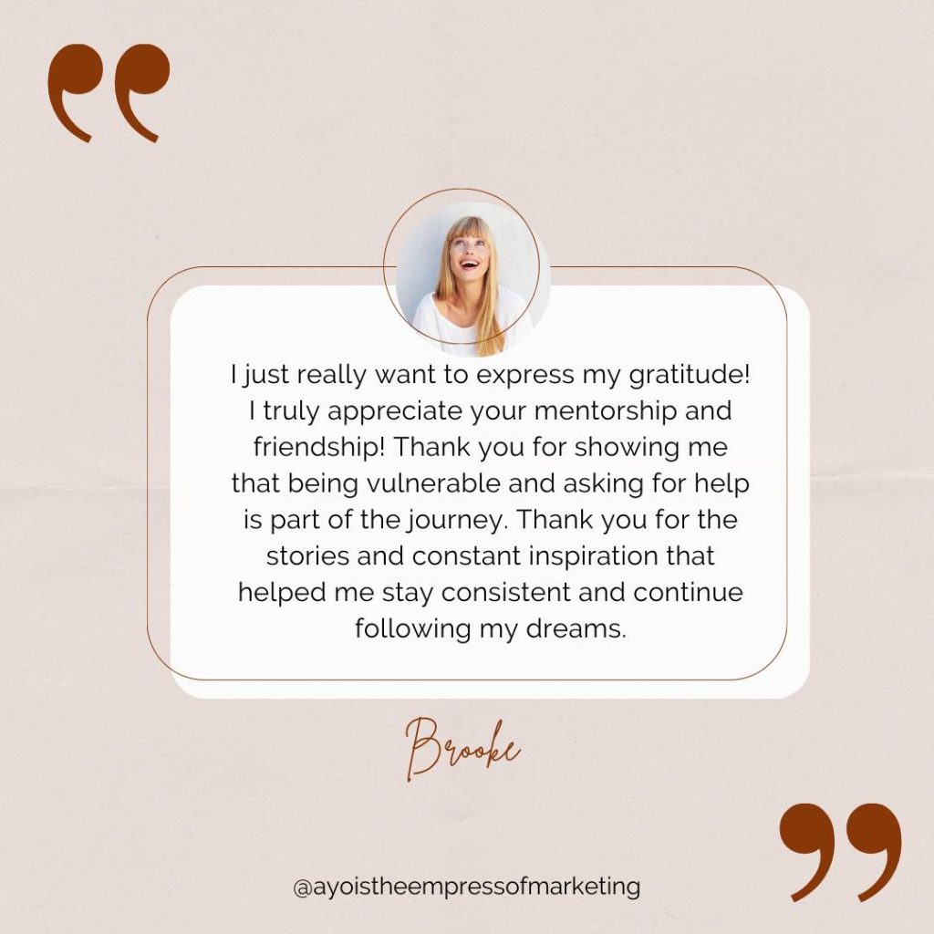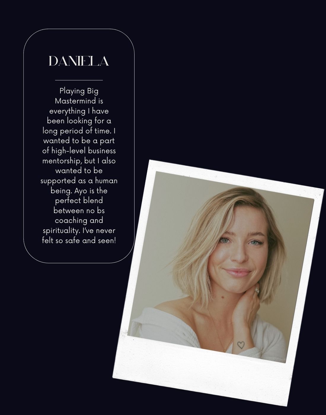 This mastermind is everything I have been looking for a long period of time. I wanted to be a part of high-level business mentorship, but I also wanted to be supported as a human being. Ayo is the perfect blend between no bs coaching and spirituality. I’ve never felt so safe and seen!
