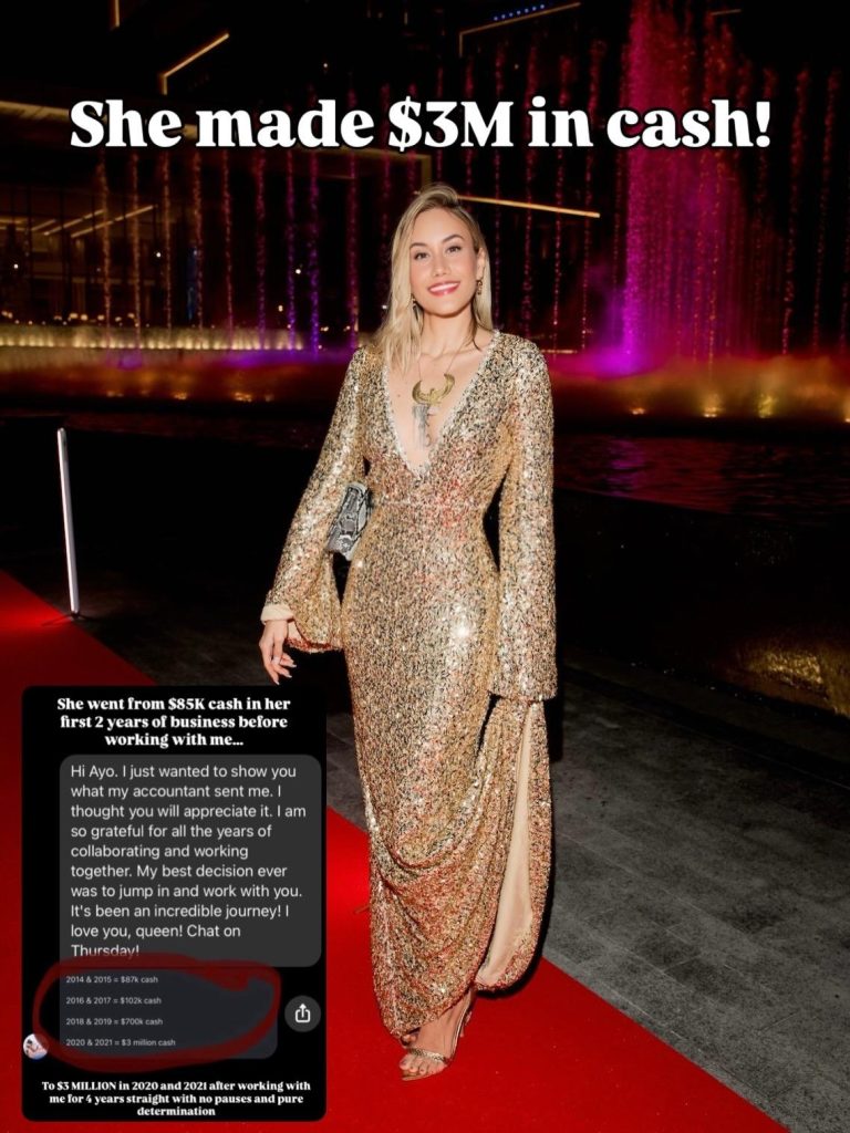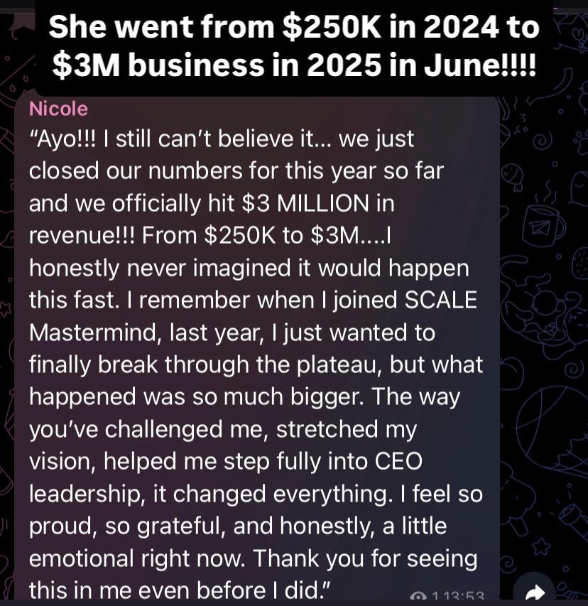 The SCALE MASTERMIND synthesizes decades of proven business coaching, distilled from tens of thousands of scale-up success stories and the exact principles used by today’s most successful millionaires and billionaires coached by Ayo. This 12-month mastermind is for women who want to make “f$ck you”money, be bad asses, live their best lives, make a difference, change lives, and wake up every morning saying: “What is my life 🤯”